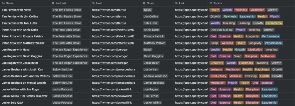 - Curated Notion spreadsheet of more than 60 of the best podcast episodes.